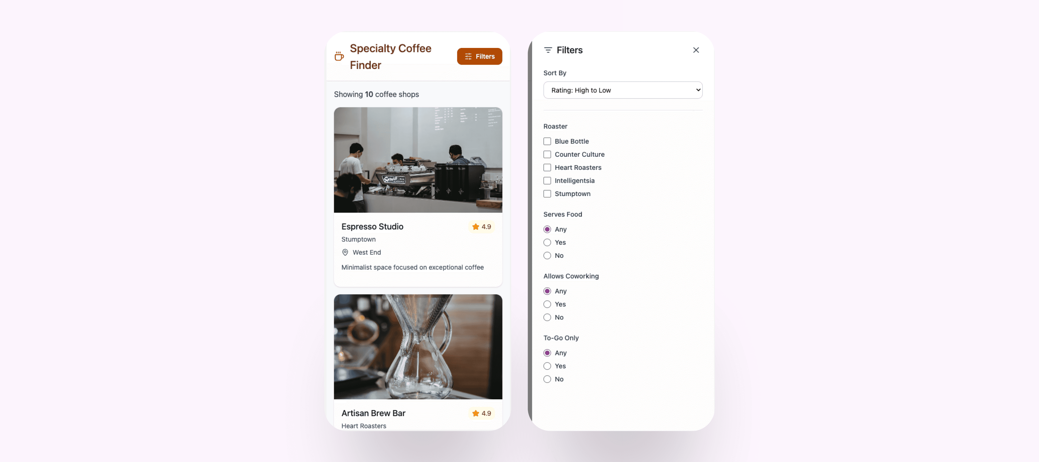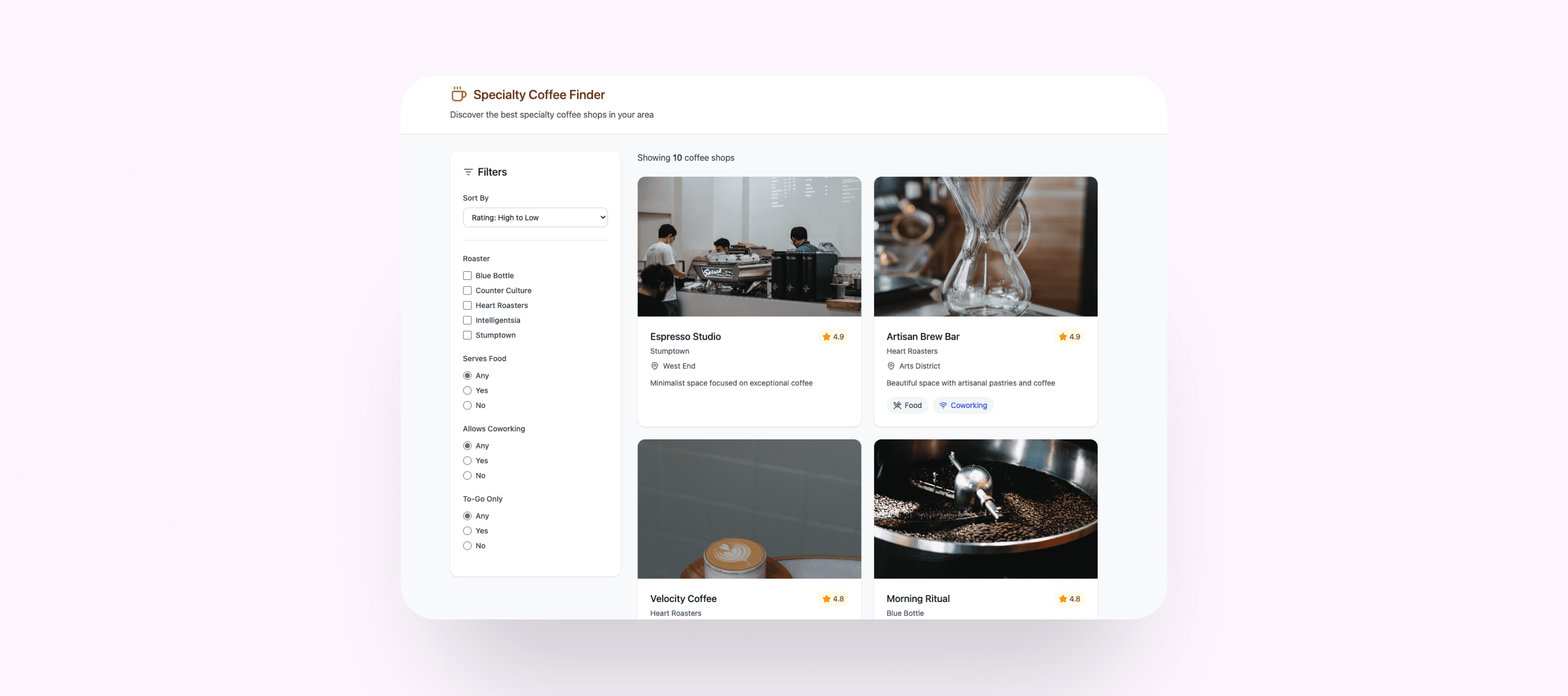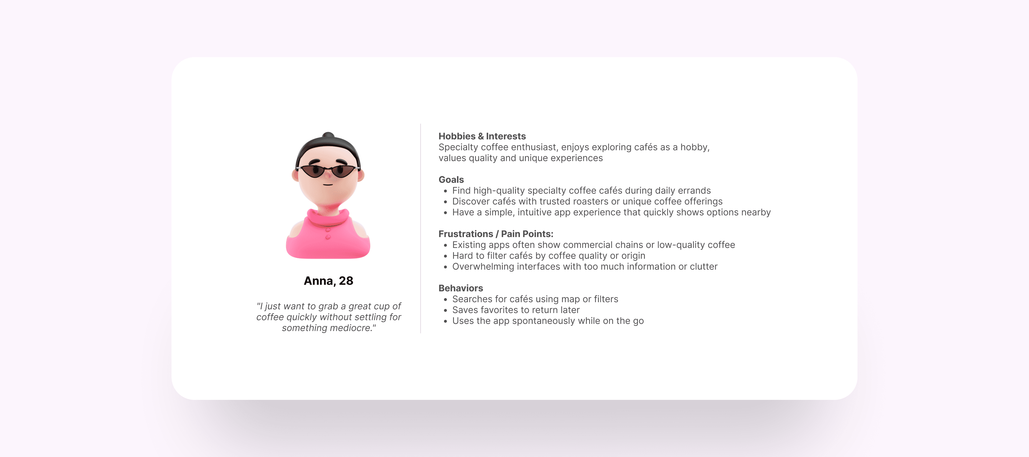 Specialty coffee enthusiasts have specific expectations and knowledge; the app needed to highlight only authentic cafés and avoid large commercial chains.