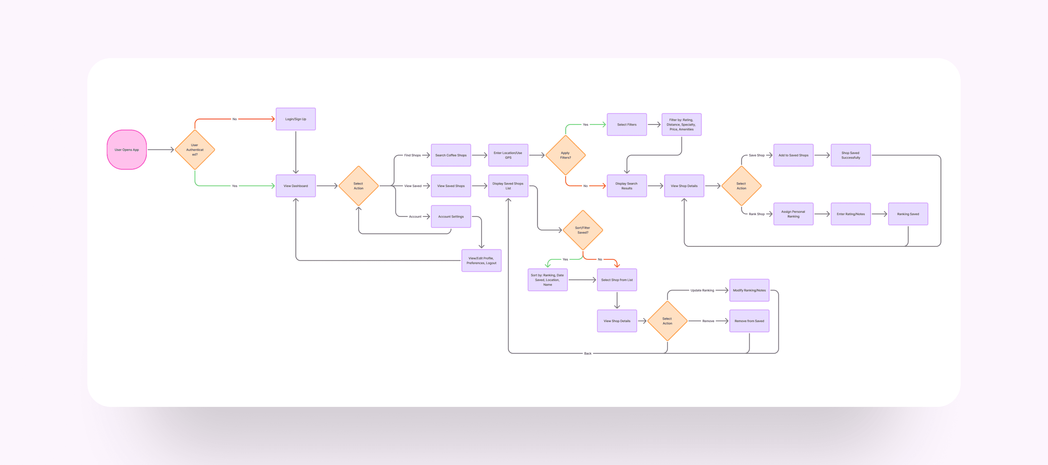 User Journey Mapping: Mapped and analyzed key user flows (search, map-based exploration, favorites, and user profiles) to optimize clarity and usability for specialty coffee enthusiasts, using insights from Airbnb’s map/grid interaction and TripAdvisor structure.